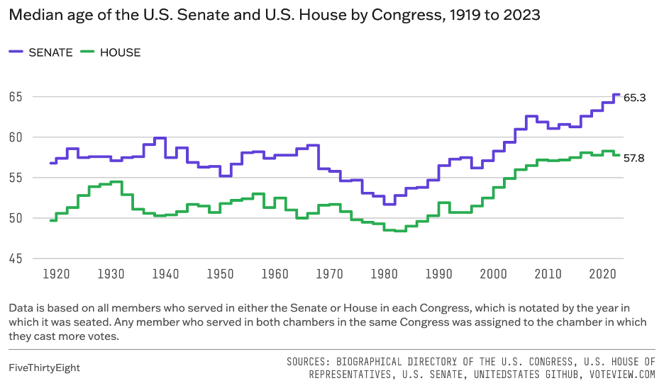 Over the past few years 50 years, the average age of our Senate has risen about a decade to 65 years old. The House of Representatives is younger than the Senate, but they’ve also gotten older in a similar fashion.